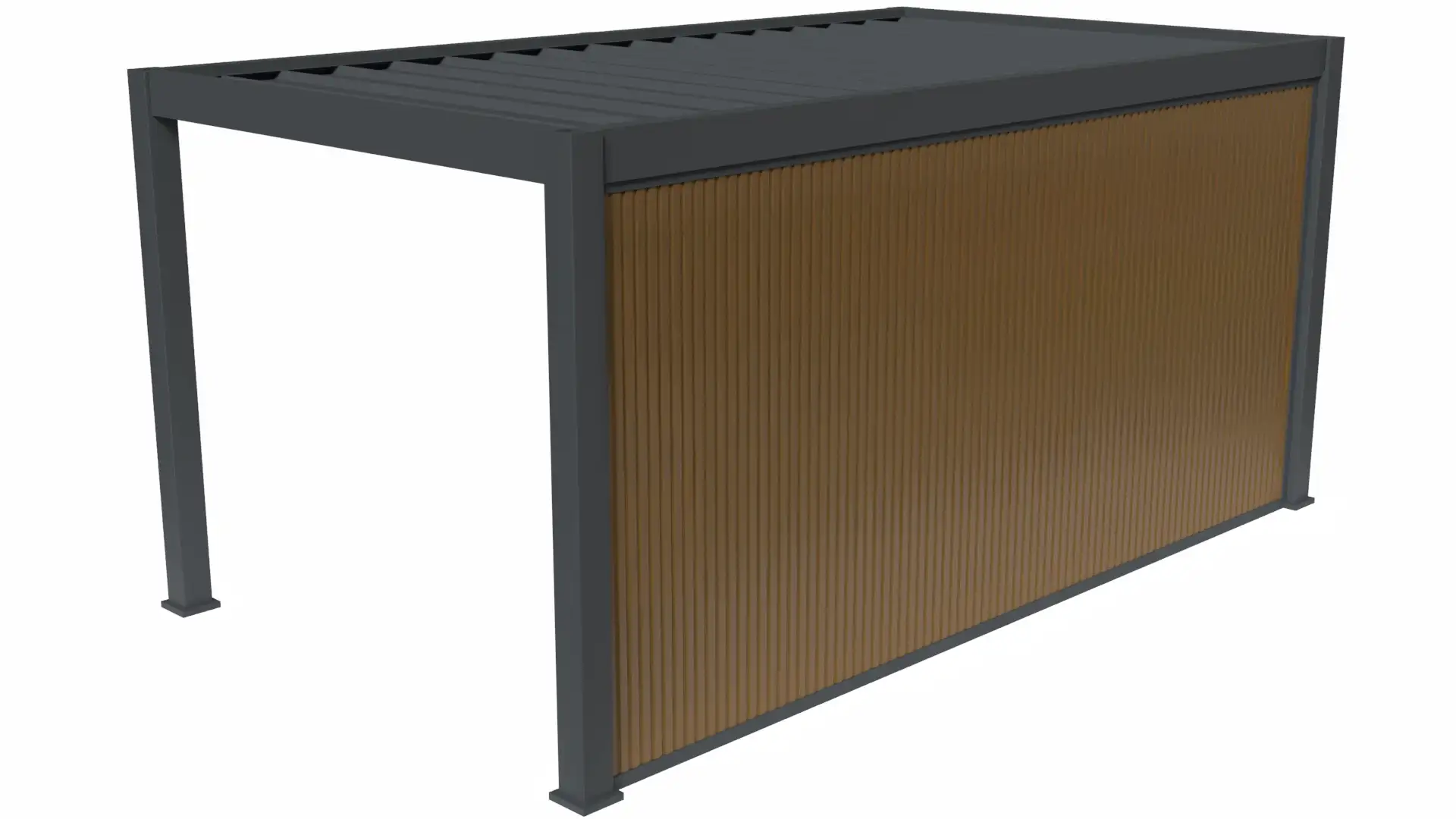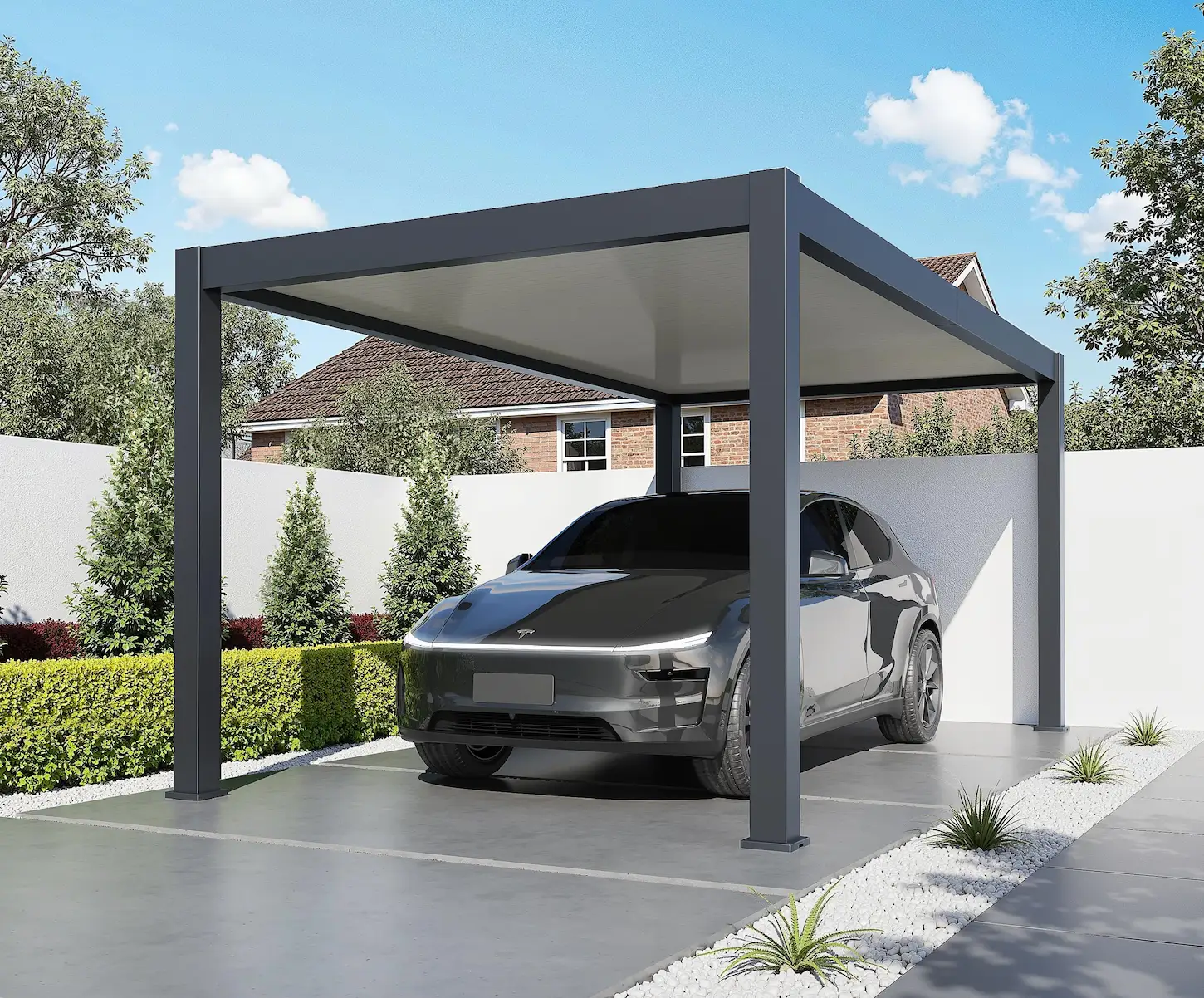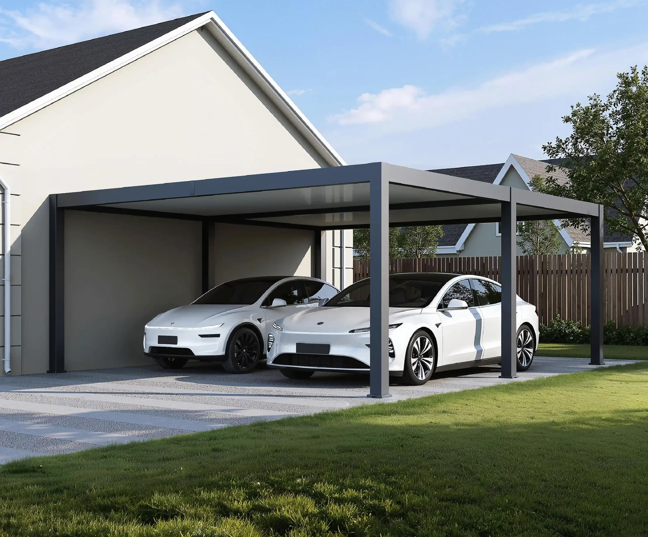 The Rockford aluminium carport is built for those who want a solid, long-lasting and low-maintenance solution. The frame is made entirely of aluminium and assembled with stainless steel fasteners and galvanised steel components. The roof is made of 36 mm thick sandwich panels with an insulating core. These robust panels are fully waterproof, reduce noise from rain and help limit heat and condensation compared to single-layer sheets. Drainage is neatly integrated into the frame. Rainwater flows from the roof into hidden gutters and is drained through the posts and base plates. The Rockford carport is designed for year-round protection and can handle heavier weather conditions. With a fully enclosed roof, it offers maximum shelter and comfort.