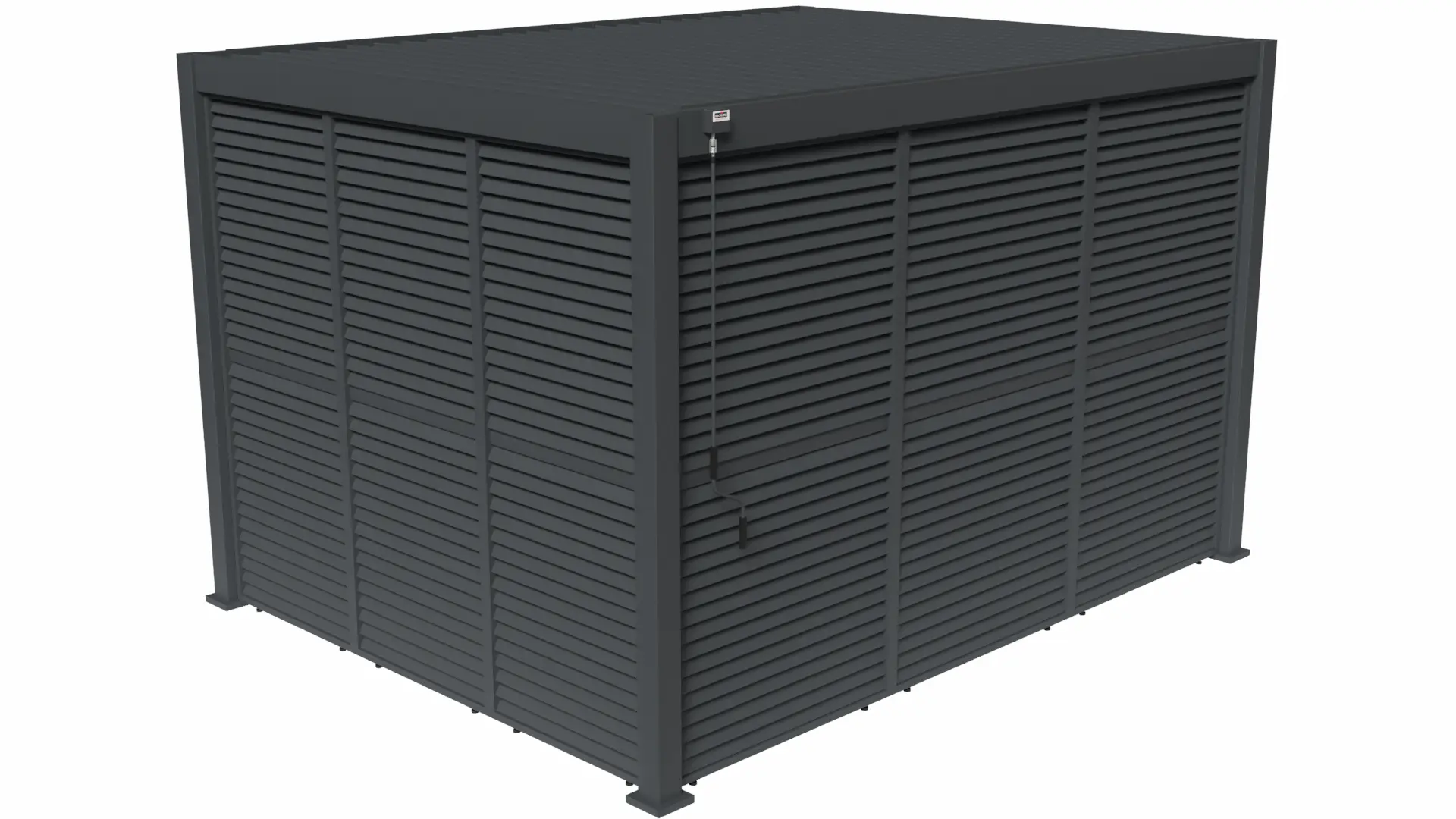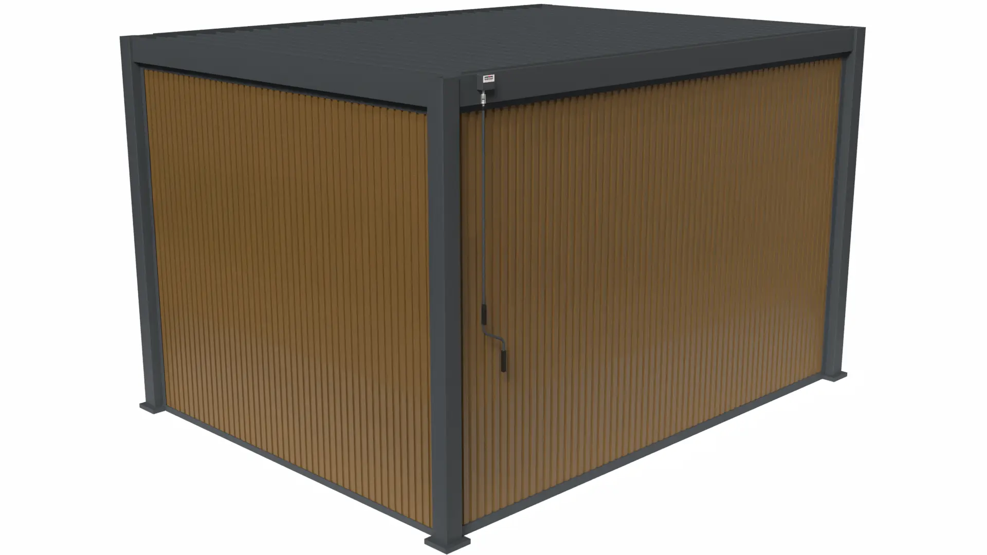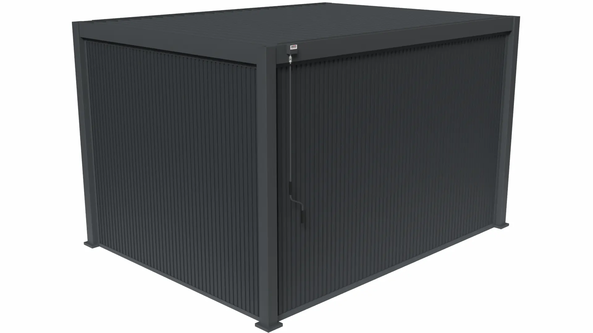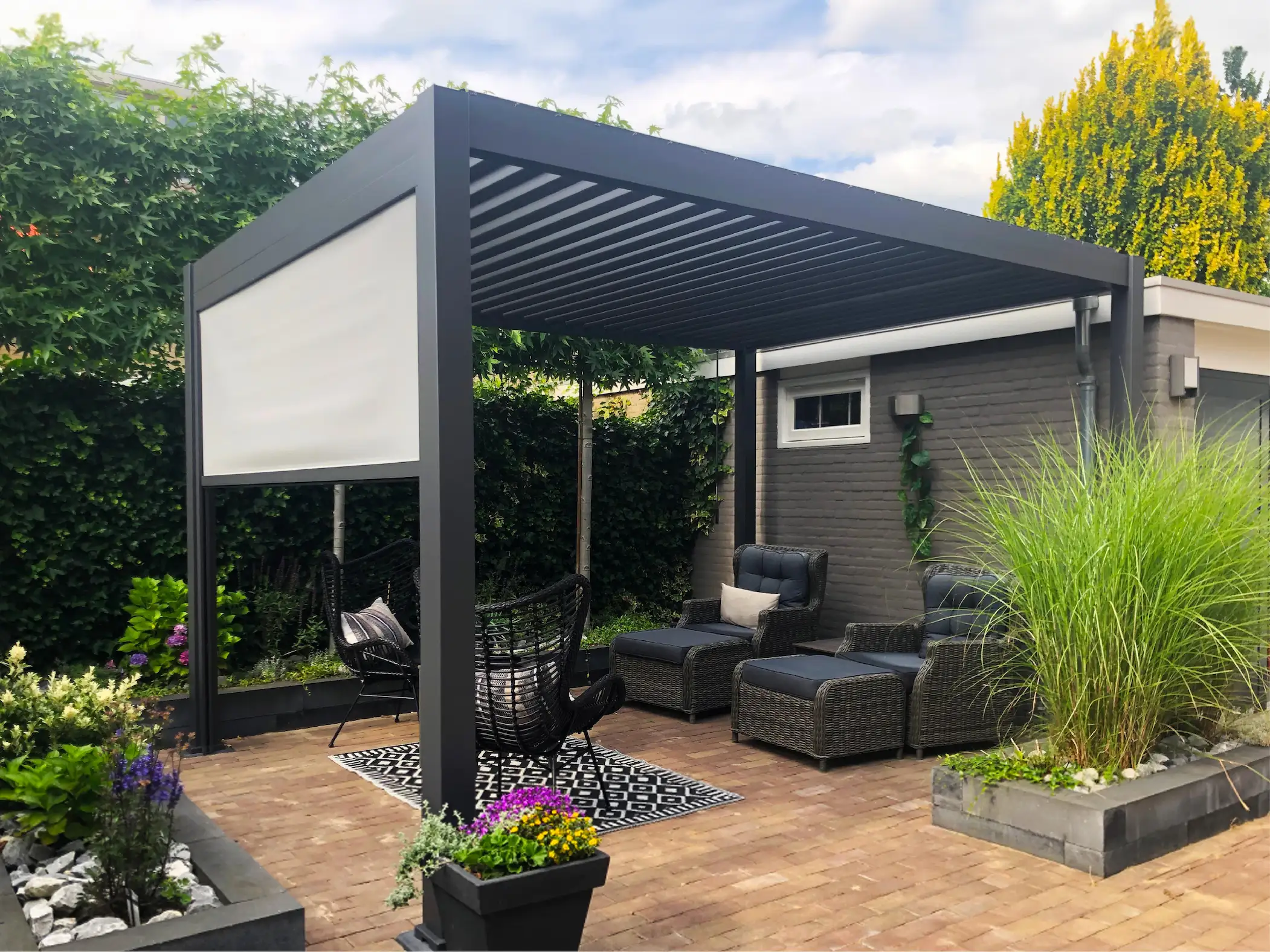 This pergola is made entirely of aluminium and finished in matte anthracite. The adjustable louvres in the roof offer the perfect balance between sun and shade. When it rains, the louvres close fully and the smart integrated drainage system guides the water down through the posts. The pergola is strong, weather-resistant and low-maintenance. Perfect for years of carefree outdoor living. With accessories like sunshades, glass sliding walls and louvred panels, you can customise your pergola just the way you want it.