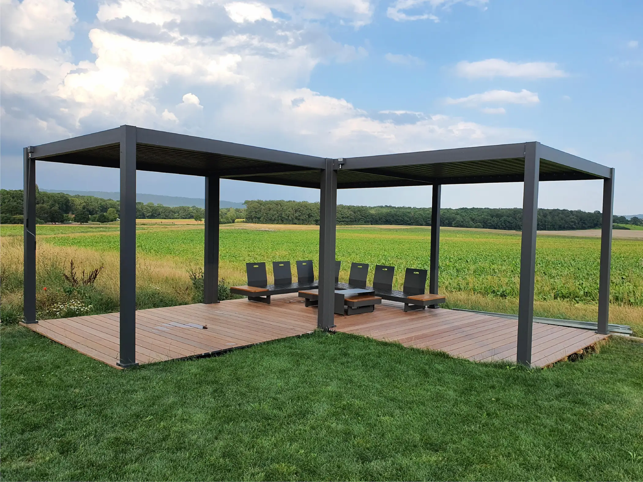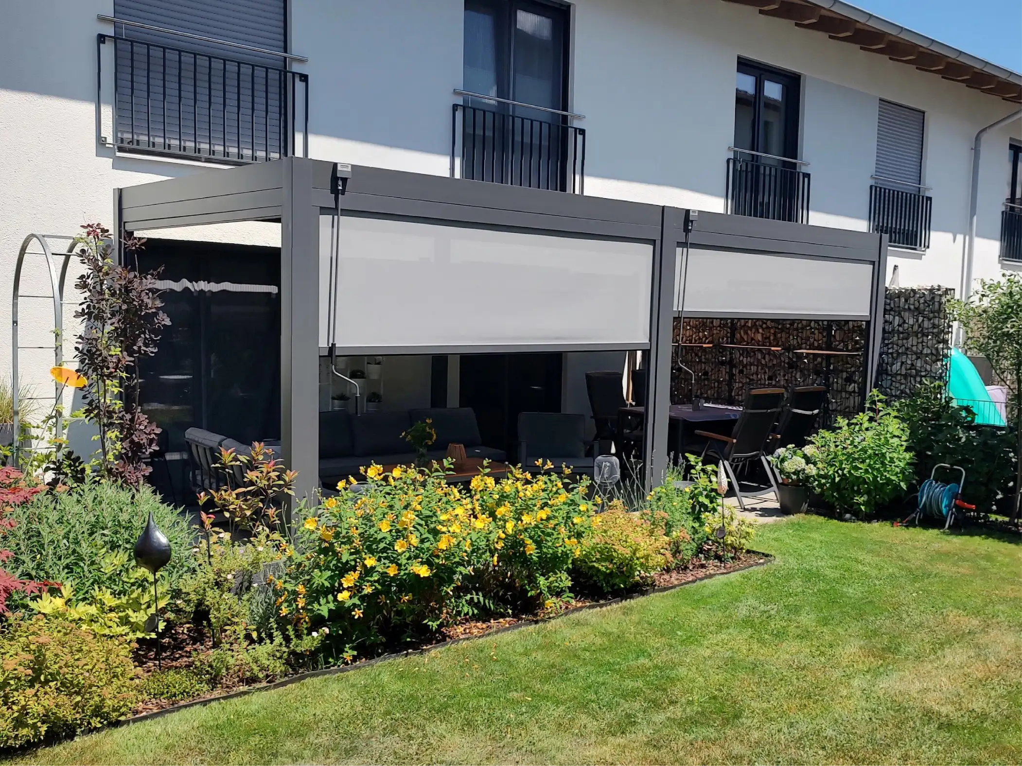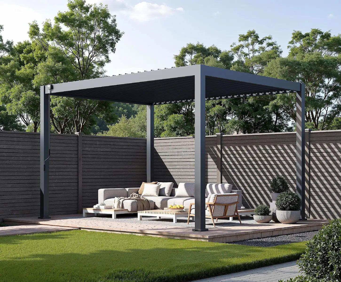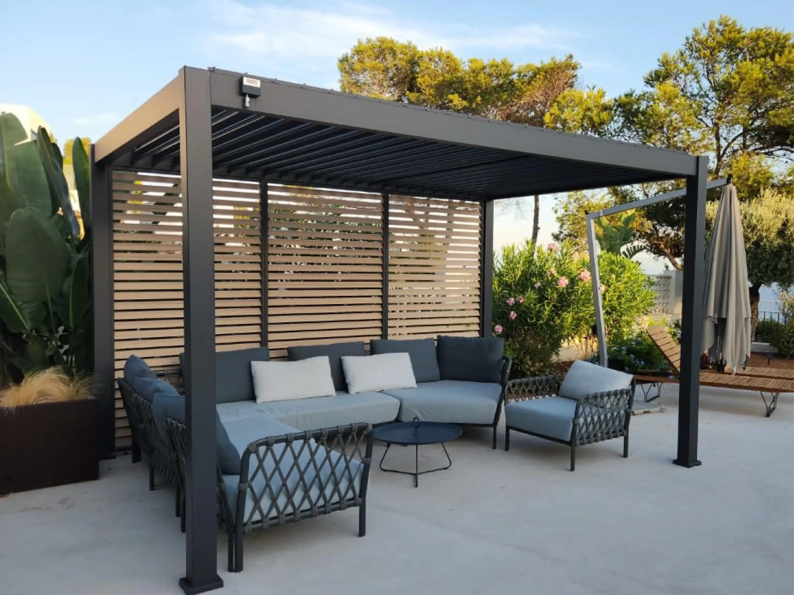 This pergola is made entirely of aluminium and finished in matte anthracite. The adjustable louvres in the roof offer the perfect balance between sun and shade. When it rains, the louvres close fully and the smart integrated drainage system guides the water down through the posts. The pergola is strong, weather-resistant and low-maintenance. Perfect for years of carefree outdoor living. With accessories like sunshades, glass sliding walls and louvred panels, you can customise your pergola just the way you want it.