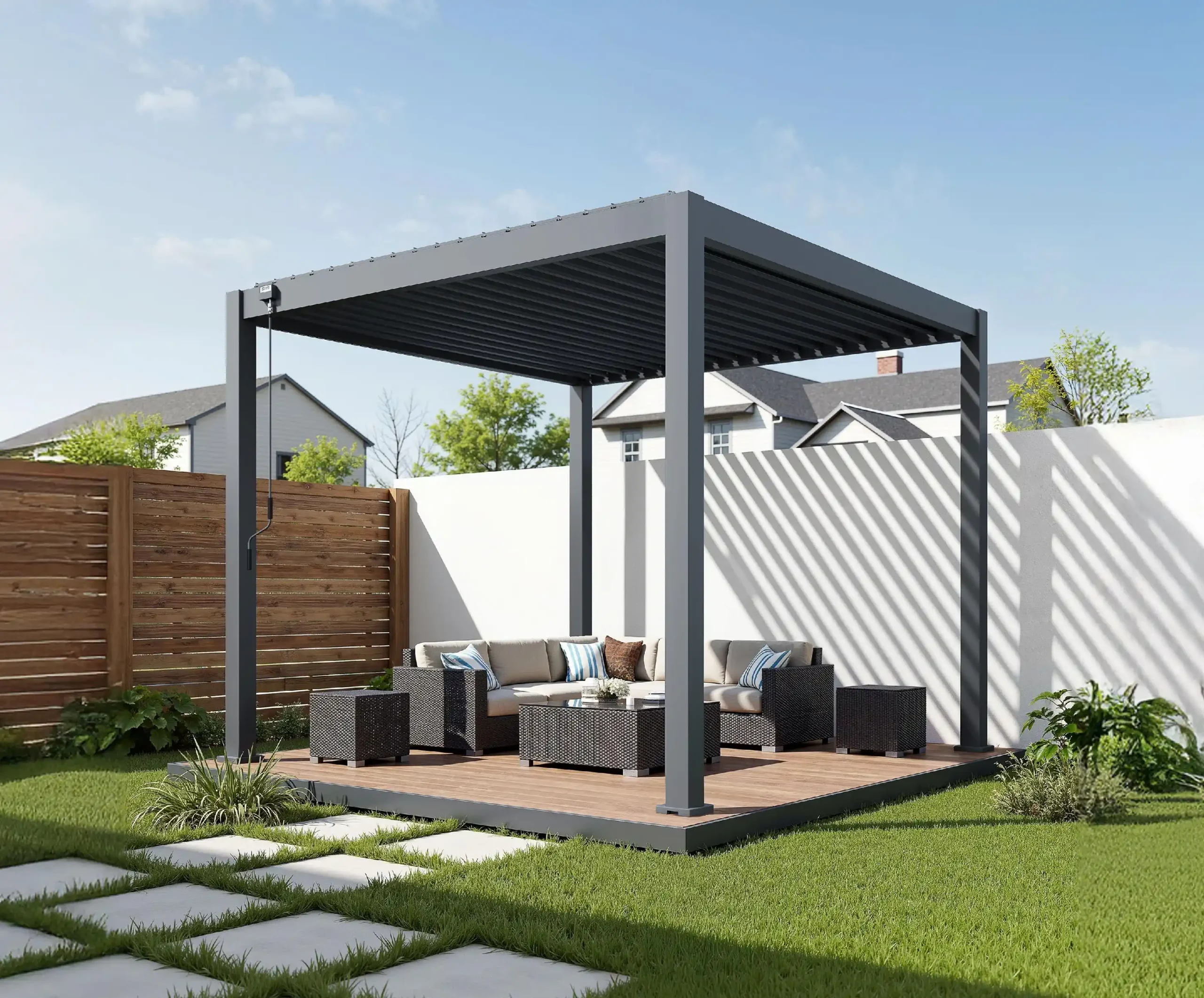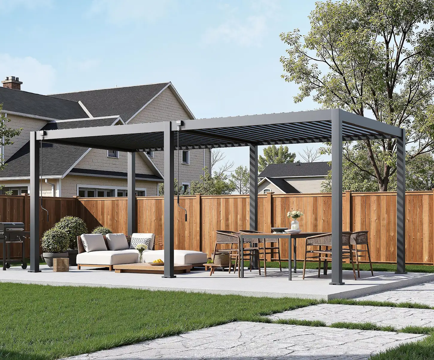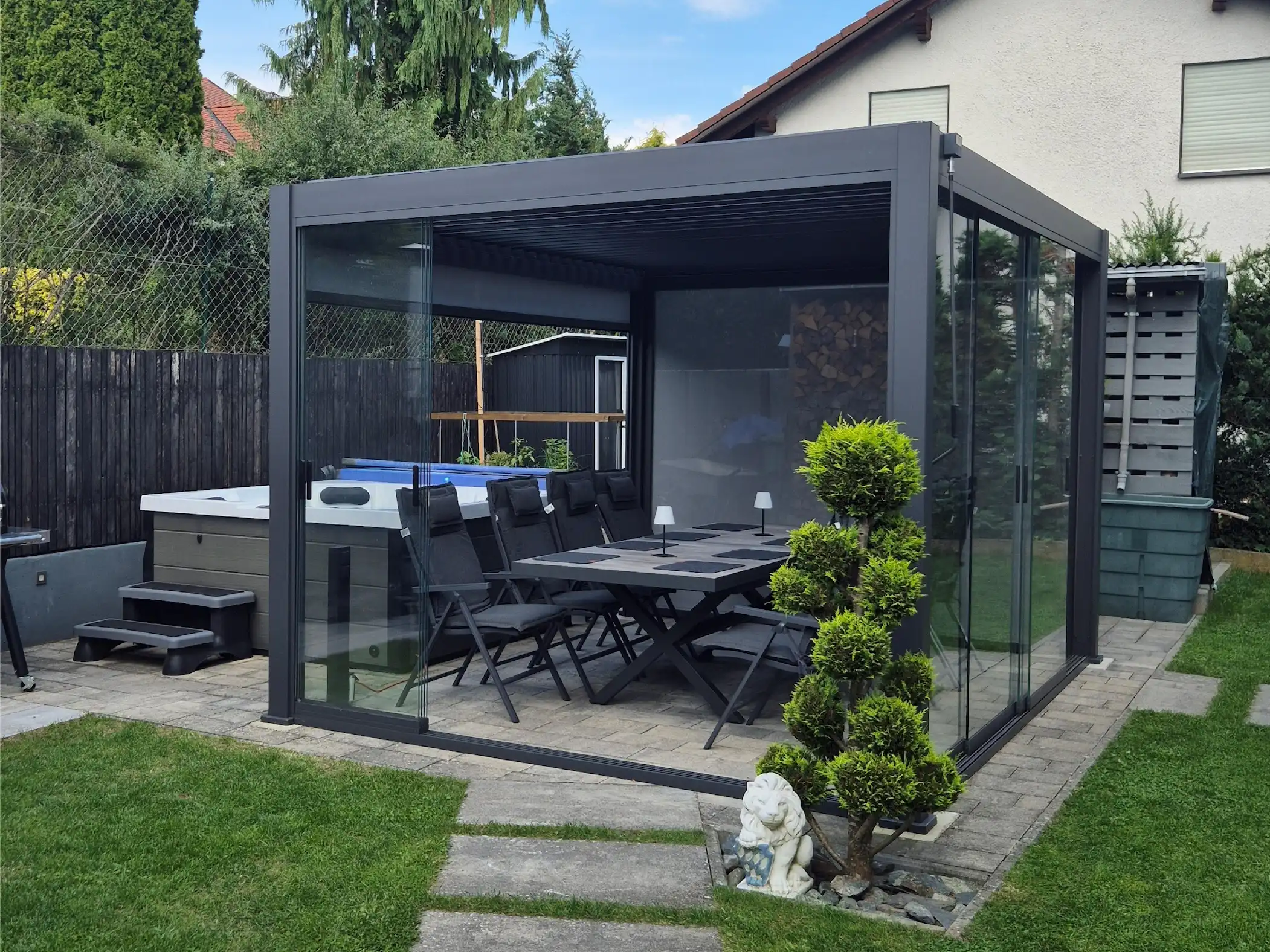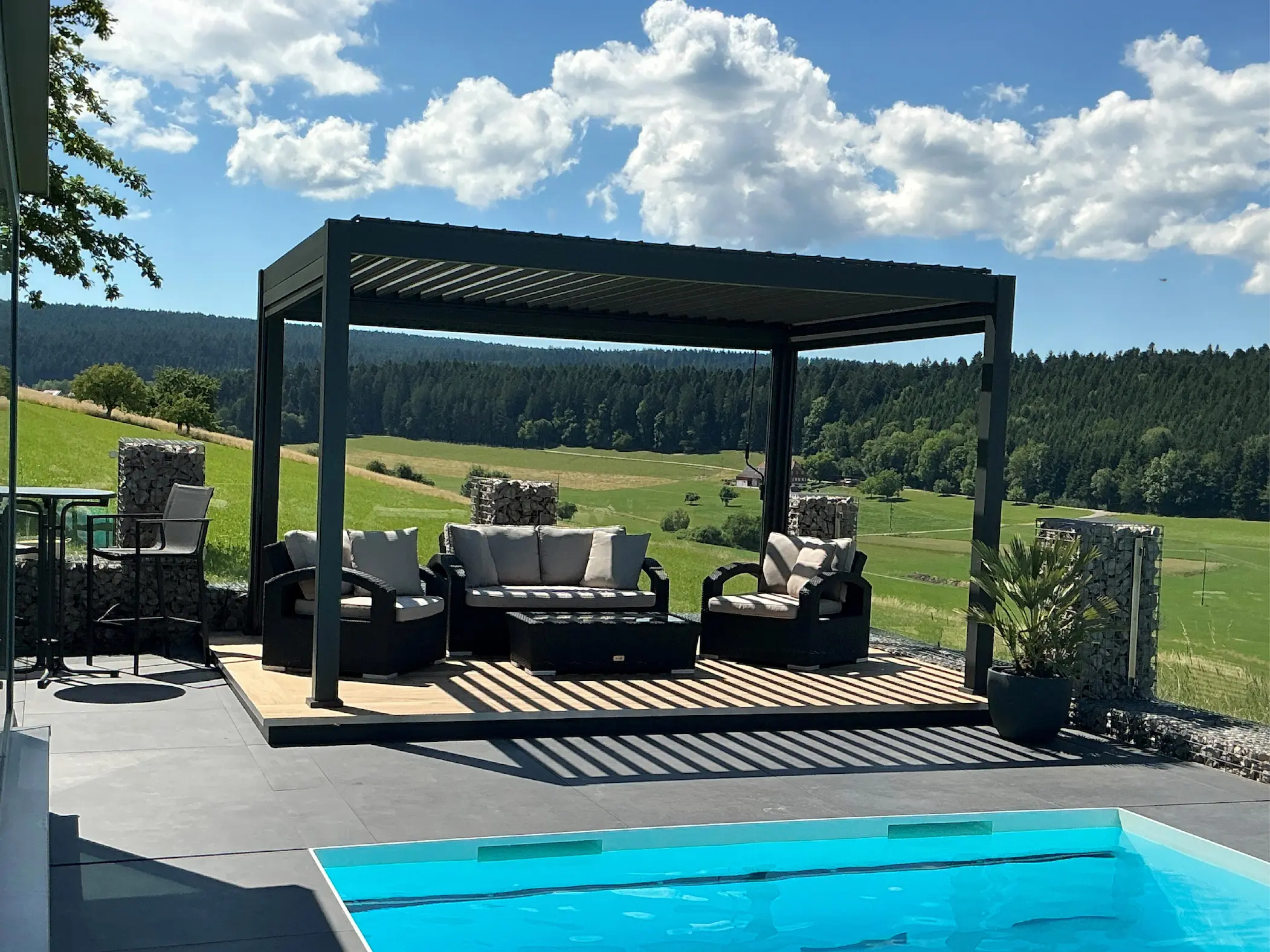 This pergola is made entirely of aluminium and finished in matte anthracite. The adjustable louvres in the roof offer the perfect balance between sun and shade. When it rains, the louvres close fully and the smart integrated drainage system guides the water down through the posts. The pergola is strong, weather-resistant and low-maintenance. Perfect for years of carefree outdoor living. With accessories like sunshades, glass sliding walls and louvred panels, you can customise your pergola just the way you want it.