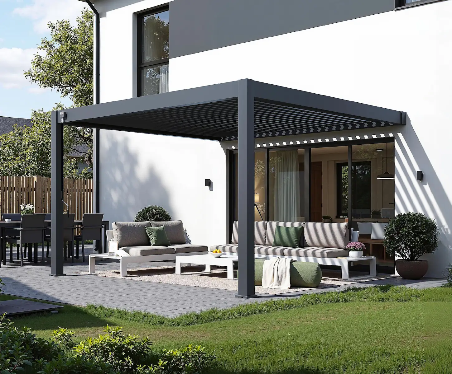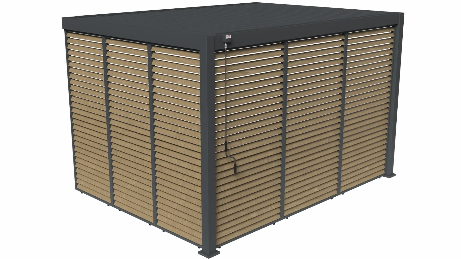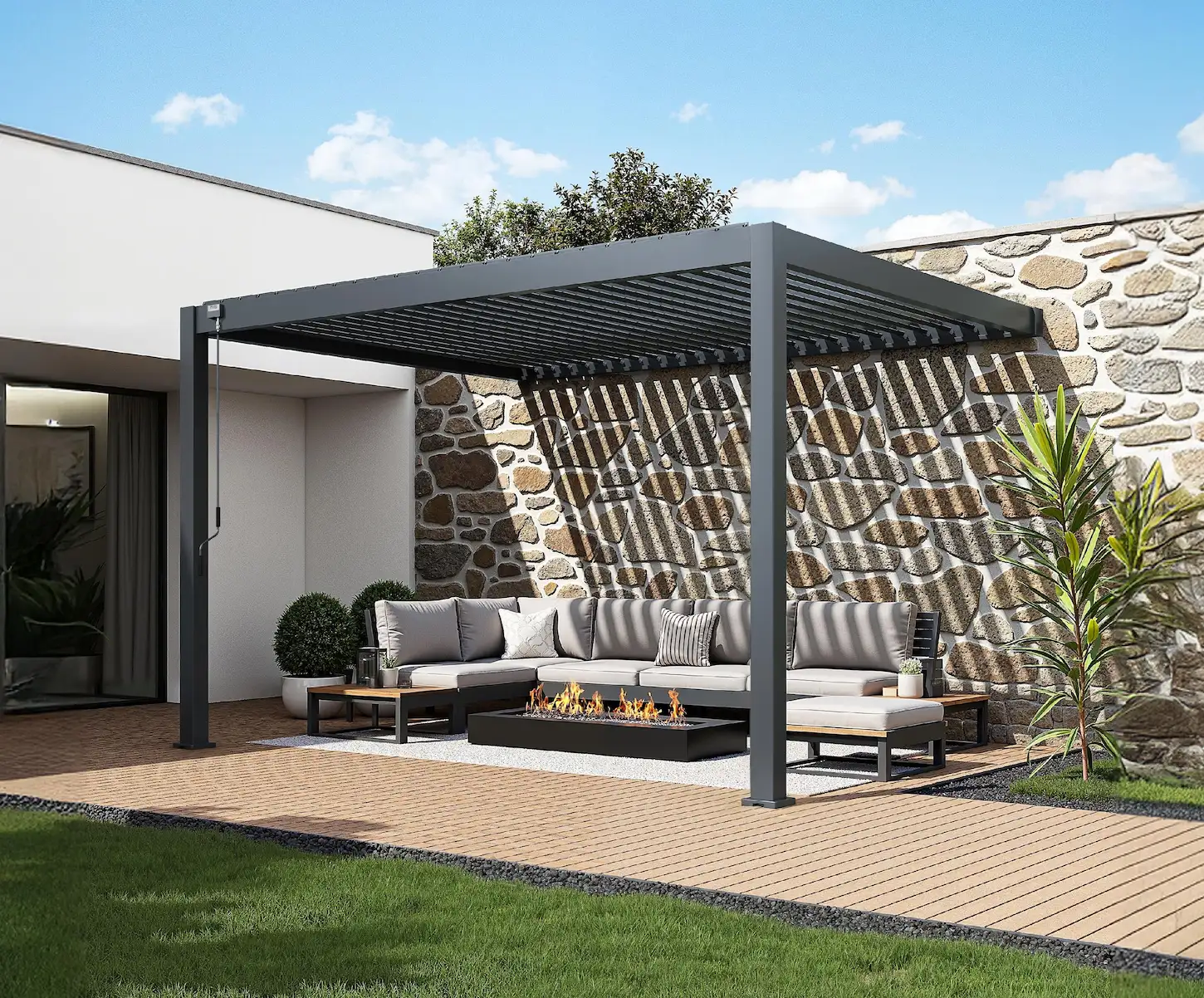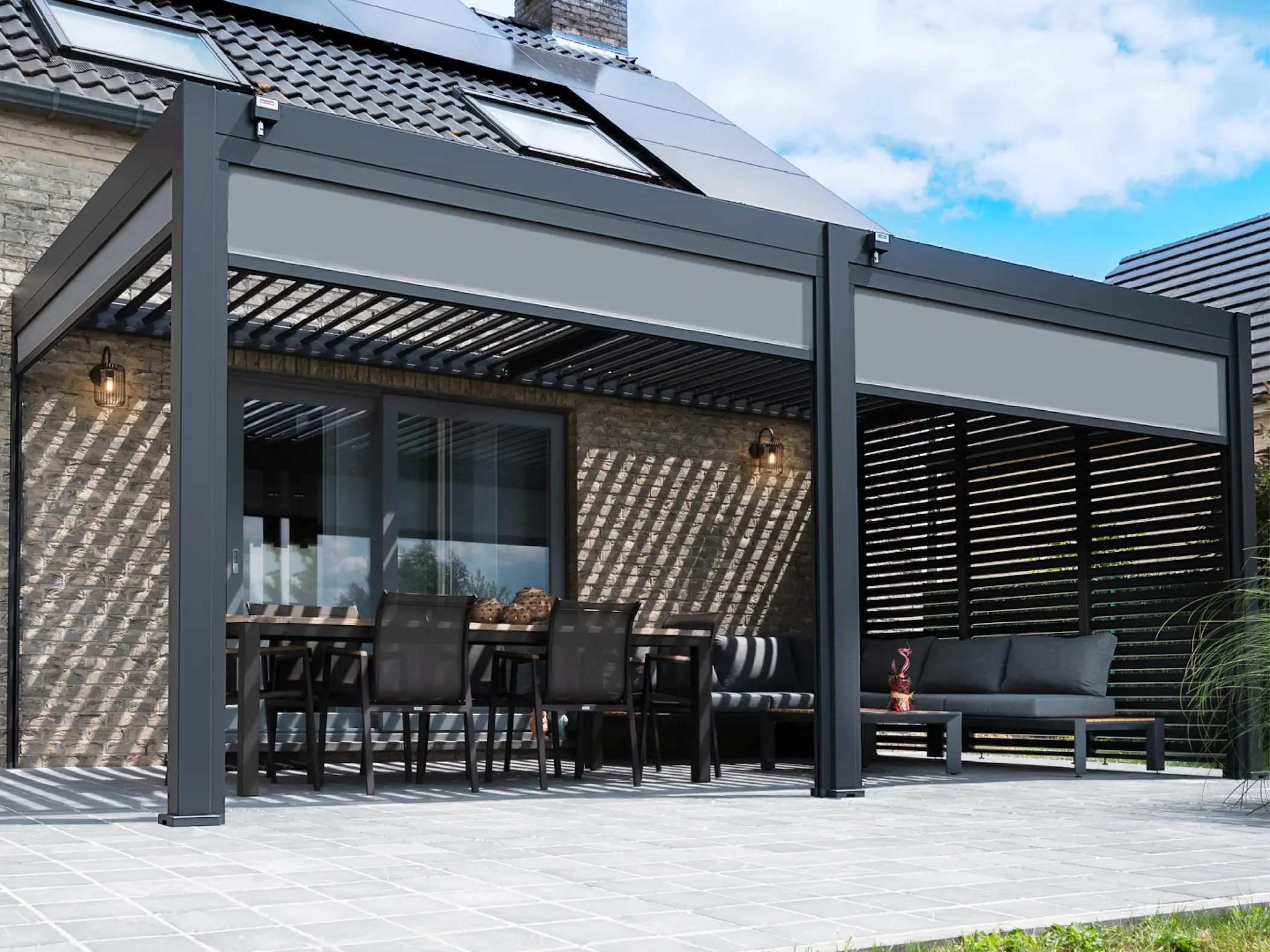 The Rockford attached pergola creates a sheltered space right next to your home. The aluminium frame and matte anthracite louvred roof blend in perfectly with a modern garden. The manually adjustable louvres let you decide how much sunlight or ventilation you want, without needing electricity. Rainwater is neatly drained through integrated gutters and down the posts. The pergola is easy to assemble and can be extended with accessories like glass sliding walls, curtains or louvred panels.