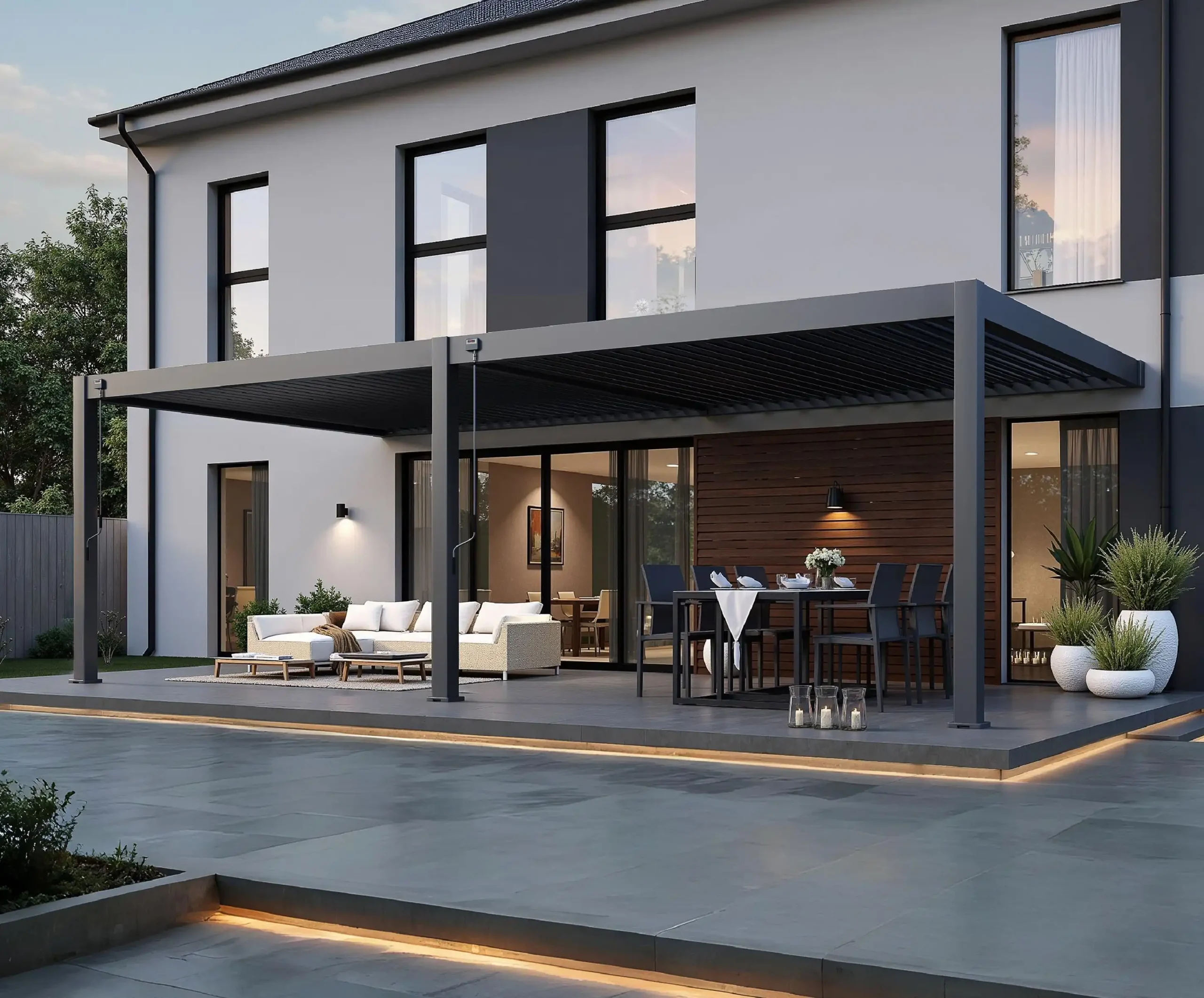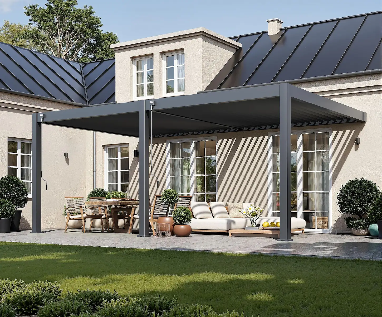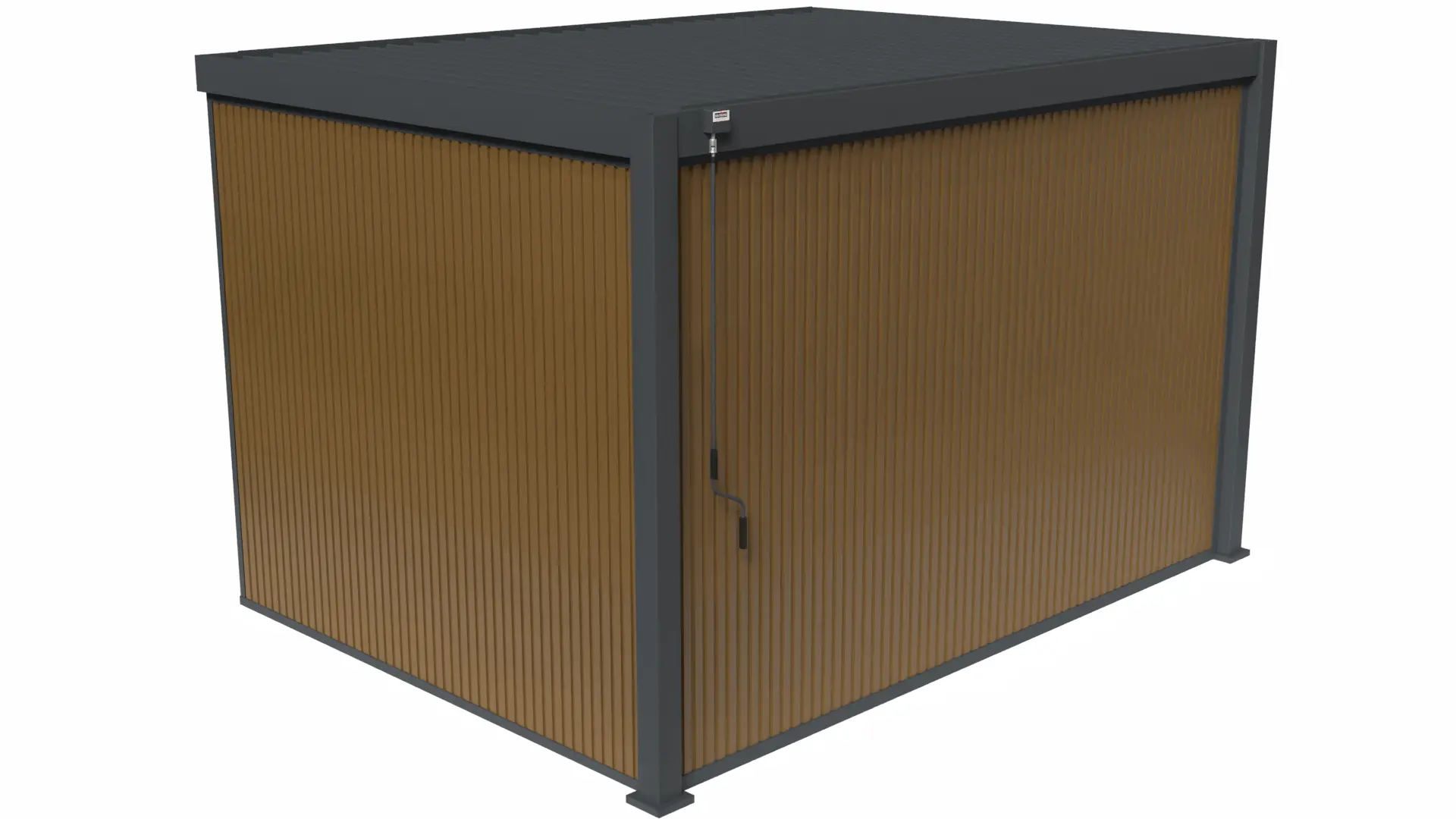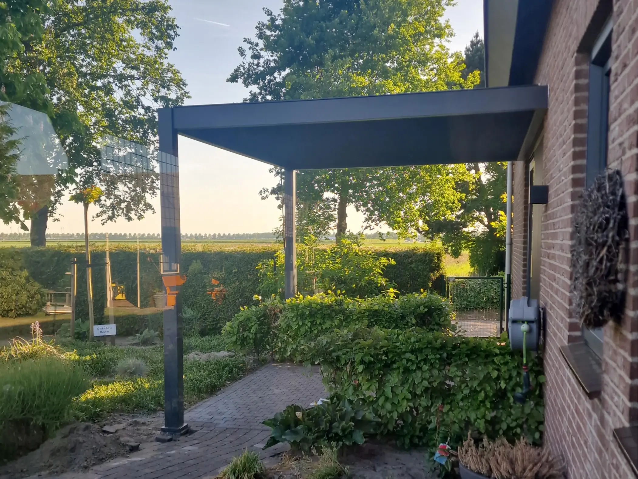 The Rockford attached pergola creates a sheltered space right next to your home. The aluminium frame and matte anthracite louvred roof blend in perfectly with a modern garden. The manually adjustable louvres let you decide how much sunlight or ventilation you want, without needing electricity. Rainwater is neatly drained through integrated gutters and down the posts. The pergola is easy to assemble and can be extended with accessories like glass sliding walls, curtains or louvred panels.